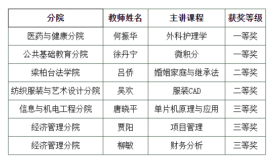 经分院推荐,教务处与学院工会联合组织专家进行评选,拟确定何振华等7位教师获2023年院级青年教师教学竞赛一、二、三等奖(获奖教师名单详见下表)。同时根据相关通知以及绍兴文理学院教务处推荐要求,我院可推荐理科组一名代表学院参加省级比赛。我院拟推荐徐丹宁老师代表学院参加理科组比赛。现将院内竞赛评选结果予以公示,公示时间为三天(2021年6月9日-6月12日),若有异议,请联系教务处教师教学发展中心,电话:88348633,联系人:马为。