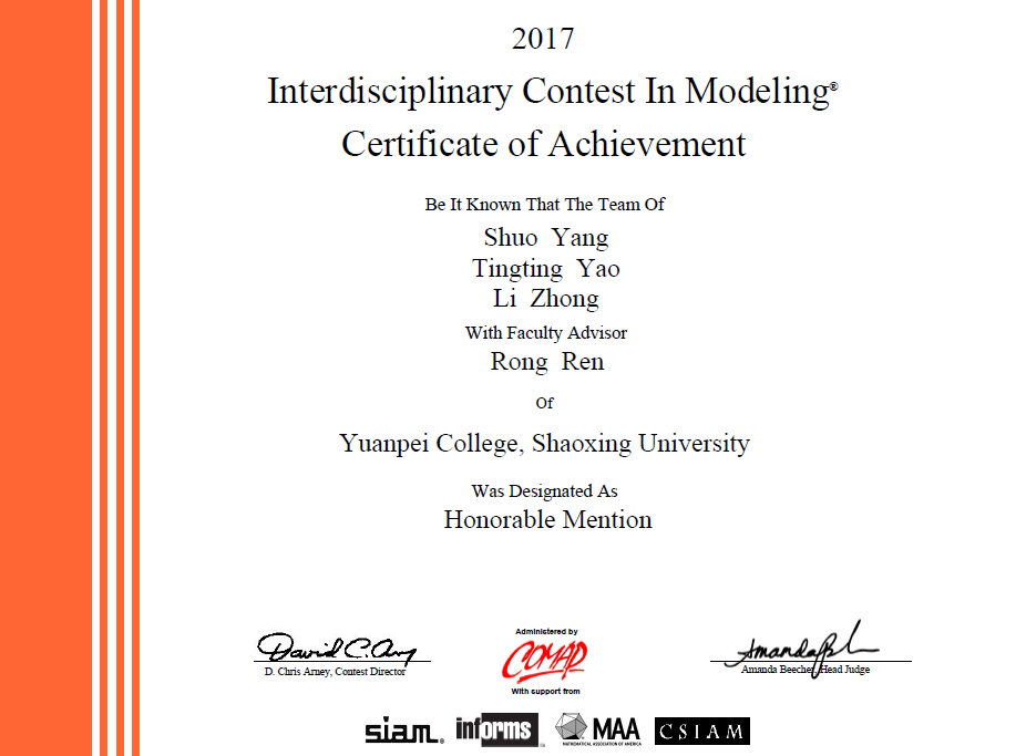 据COMAP(美国数学及应用联合会)公布,2017年共有来自中国、美国、加拿大、芬兰、香港、印度、印度尼西亚、日本、澳门、墨西哥、苏格兰、新西兰、新加坡、南非、韩国、西班牙、瑞典和英国等18个国家和地区共16928支队伍参赛,其中来自哈佛、麻省理工和我国的北京大学、清华大学等知名高校学生均参与了此项赛事的角逐。我院获奖学生名单如下: