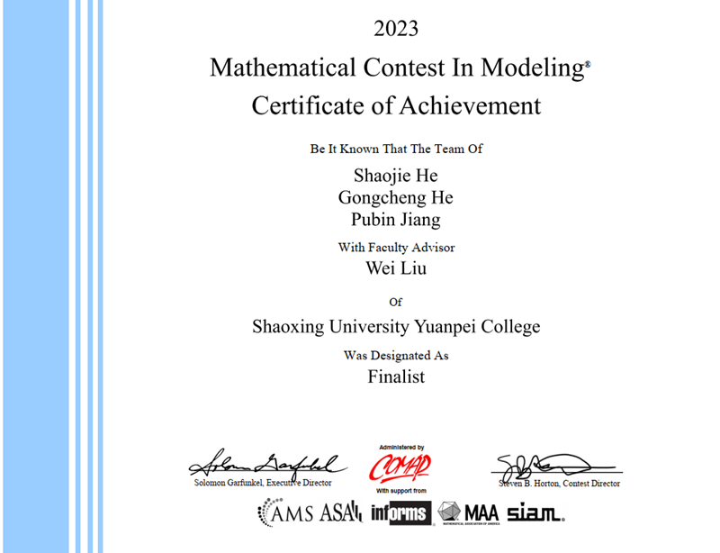 我院学子在美国大学生数学建模竞赛中获Finalist奖(特等奖提名奖)