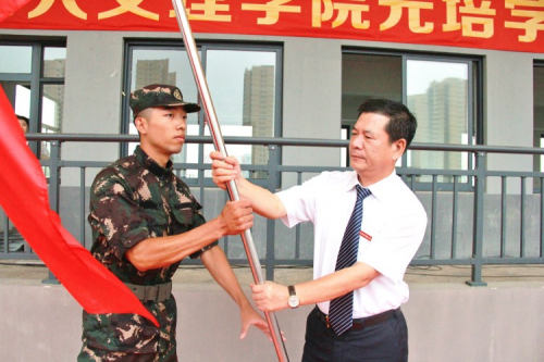 开营式上举行隆重的升旗仪式,叶访春书记向军训团授团旗,沈红卫院长作军训动员报告,杨建富政委作军训讲话,军训教官和学员代表作表态发言。